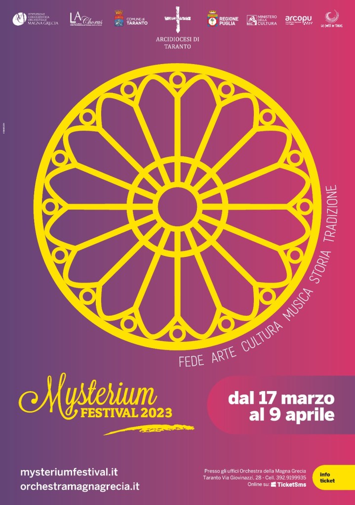 In programma dallo scorso 17 marzo fino al prossimo 9 aprile, il Mysterium Festival 2023 che si avvale della direzione artistica dei Maestri Piero Romano e Pierfranco Semeraro, è organizzato da Le Corti di Taras in collaborazione con Arcidiocesi di Taranto, Comune di Taranto, Orchestra della Magna Grecia, Chorus e ARCoPU; con il patrocinio di Ministero della Cultura e Regione Puglia e il sostegno di BCC San Marzano di San Giuseppe, Teleperformance, Varvaglione Vini, Comes, Programma Sviluppo, Caffè Ninfole, Baux Cucine e Chemipul.