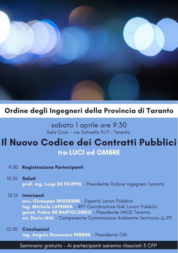 Il Nuovo Codice dei Contratti Pubblici, tra luci e ombre” è il titolo dell’incontro organizzato dall’Ordine degli Ingegneri della provincia di Taranto.