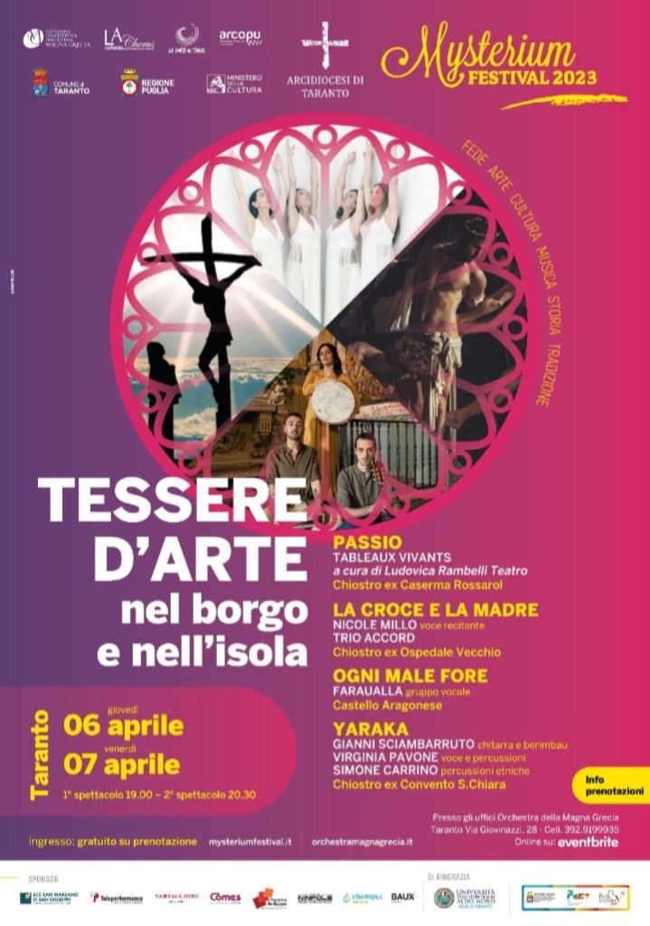 Denso programma di appuntamenti prima del concerto di Pasqua. In Città nuova e Città vecchia, dai “Tableaux vivants” (Chiostro ex Caserma Rossarol) a “La croce e la Madre” (Chiostro ex Ospedale vecchio), proseguendo con “Ogni male fore” con i Faraualla (Castello aragonese) e Yaraka (Chiostro ex Convento Santa Chiara). Spettacoli alle 19.00 e alle 20.30