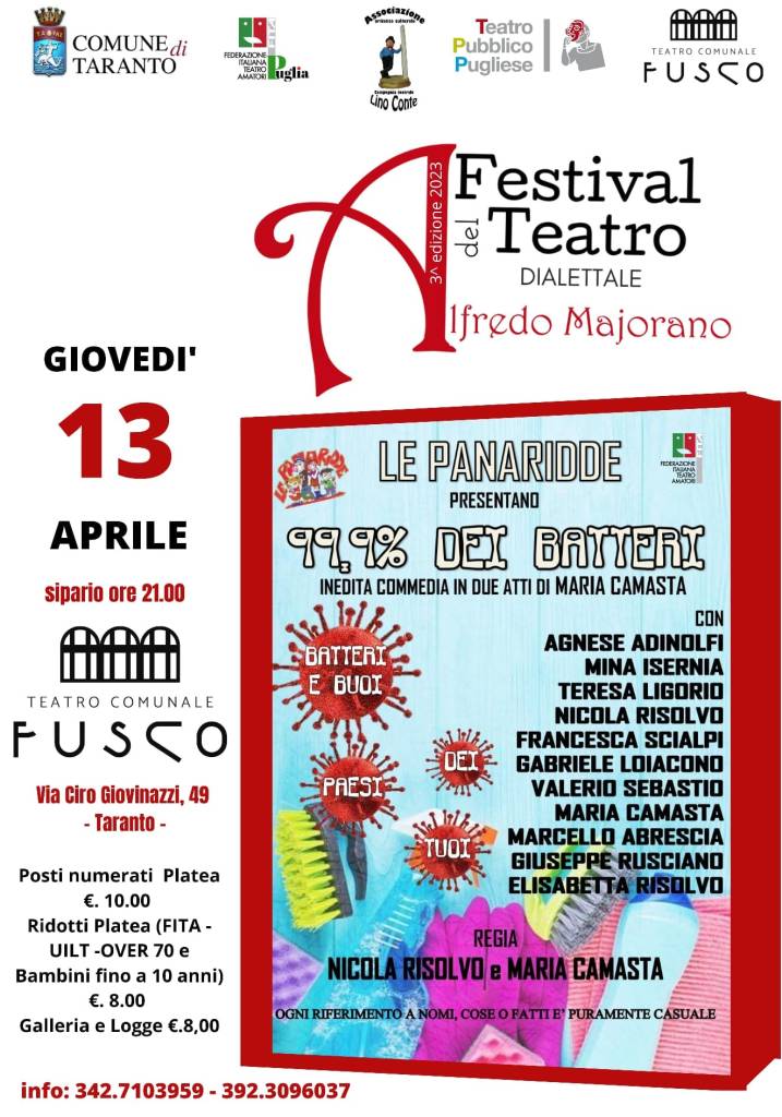 Uno spettacolo divertentissimo. Dopo la pausa pasquale terzo ed ultimo appuntamento in cartellone per Il “Festival del Teatro Amatoriale Dialettale Alfredo Majorano”, istituito dal Comune di Taranto e giunto alla terza edizione, realizzato dall’Associazione Artistico Culturale “Compagnia Teatrale Lino Conte” su mandato della Fita Puglia.