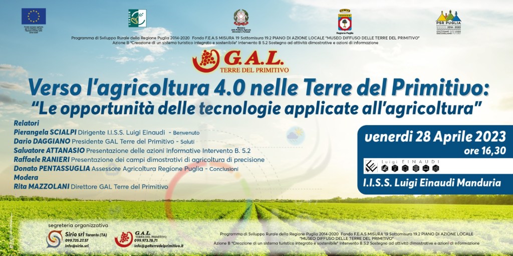 Se ne parla nel convegno di studi “Verso l’agricoltura 4.0 nelle Terre del Primitivo – Le opportunità delle tecnologie applicate all’agricoltura” a Manduria presso l’ I.I.S.S. Luigi Einaudi, venerdì 28 Aprile, alle ore 16,30