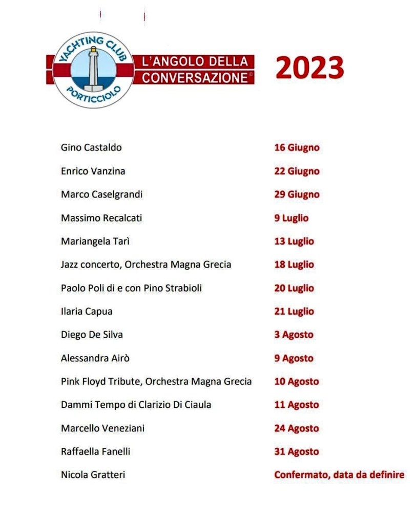 “Dietro questa rassegna – ha sottolineato Gianluca Piotti – c’è la nostra passione e un sincero interesse culturale. Lo Yachting Club continua ad investire nella cultura e crediamo fortemente in una rete di partner prima fra tutti la BCC San Marzano di San Giuseppe, una banca legata fortemente al territorio. Fra gli spettacoli teatrali, uno è stato scritto e diretto da Clarizio di Ciaula della Compagnia del Teatro Orfeo. Un ringraziamento per la preziosa collaborazione – ha concluso Piotti – va anche ai partner tecnici: Varvaglione, Palma Arredamenti e Valdo Spumanti oltre alle librerie Mondadori Bookstore, Ubik, Dickens e Mandese”. “Da diversi anni – ha spiegato Emanuele di Palma – sosteniamo L’angolo della Conversazione perché crediamo nella cultura. Questa struttura è una fra le più meritevoli della nostra attenzione. È importante fare squadra, perché soltanto così anche con piccoli investimenti possiamo realizzare eventi interessanti e portare personaggi importanti. Siamo felici che con noi ci sia anche il Comune, impegnato ad elevare il livello culturale di questa città”.