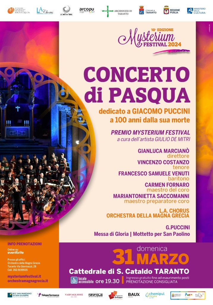 Protagonisti del “Concerto di Pasqua”, l’Orchestra della Magna Grecia diretta dal Maestro Gianluca Marcianò, il L.A. Chorus diretto da Carmen Fornaro, con Mariantonietta Saccomanni (Maestro collaboratore), i cantanti Vincenzo Costanzo (tenore) e Francesco Samuele Venuti (baritono). Info e prenotazioni: Eventbrite; Orchestra Magna Grecia – Via Ciro Giovinazzi 28, Taranto (392.9199935). Consuetudine legata al Mysterium Festival, per assicurare massima partecipazione alla comunità: la Prova generale del “Concerto di Pasqua” in programma sabato 30 marzo alle 17.30 sarà aperta al pubblico. Il Mysterium Festival con la direzione del Maestro Piero Romano, è promosso da Le Corti di Taras e realizzato in collaborazione con l’Arcidiocesi di Taranto, il Comune di Taranto, l’Orchestra della Magna Grecia, il L. A. Chorus e l’ARCoPU, con il patrocinio del Ministero della Cultura e della Regione Puglia, e con il sostegno di BCC San Marzano di San Giuseppe, Teleperformance, Varvaglione Vini, Caffè Ninfole, Programma Sviluppo, Baux Cucine e Chemipul.
