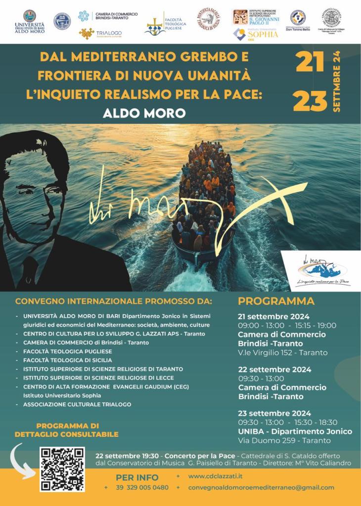 Il convegno “DAL MEDITERRANEO GREMBO E FRONTIERA DI NUOVA UMANITÁ. L’INQUIETO REALISMO PER LA PACE: ALDO MORO”, che si terrà dal 21 al 23 settembre 2024 a Taranto, è organizzato da: Università Aldo Moro di Bari Dipartimento Jonico in “Sistemi giuridici ed economici del Mediterraneo: società, ambiente, culture”, Centro di cultura per lo Sviluppo Giuseppe Lazzati APS – Taranto, Camera di commercio di Brindisi-Taranto, Facoltà teologica Pugliese, Facoltà teologica di Sicilia, Istituto Superiore di Scienze religiose di Taranto, Istituto Superiore di Scienze religiose di Lecce, Centro di alta Formazione Evangelii Gaudium (CEG) Istituto Universitario Sophia e Associazione culturale Trialogo.