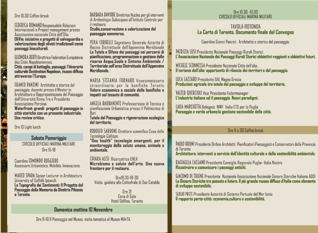 Per ideare nuovi scenari è necessaria una visione che abbracci la complessità in modo creativo: salute, ambiente, paesaggio, cultura, arte, architettura, design. «Riteniamo questo confronto fondamentale – commenta Carmelo Di Fonzo dell’ordine Architetti conservatori e paesaggisti della provincia di Taranto – per discutere di tutela e valorizzazione paesaggistica ed ambientale, disegnando nuovi modelli di sviluppo orientati su turismo, cultura e sostenibilità».