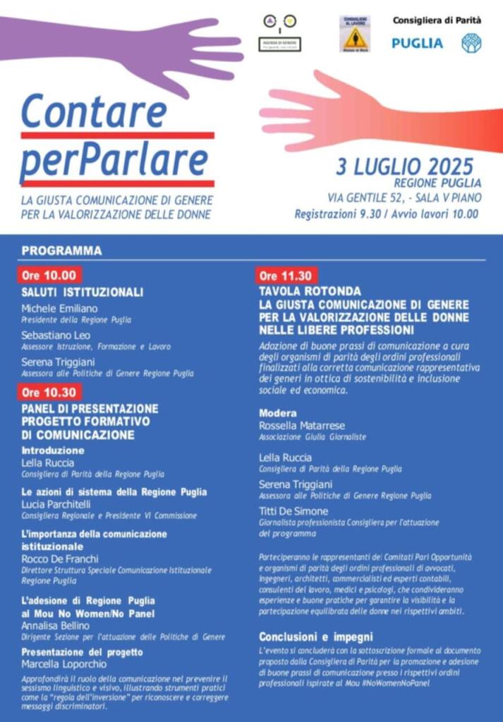Al fine di contrastare questo fenomeno, la Consigliera di Parità della regione Puglia Lella Ruccia e lo staff del suo ufficio hanno organizzato, d’intesa con l’Assessora alle Politiche di Genere Serena Triggiani e con la Consigliera del Presidente Emiliano per l’attuazione del programma di Agenda di Genere Titti De Simone, un percorso partecipativo che è stato presentato nel corso del convegno “CONTARE PER PARLARE – la giusta comunicazione di genere per la valorizzazione delle donne”.