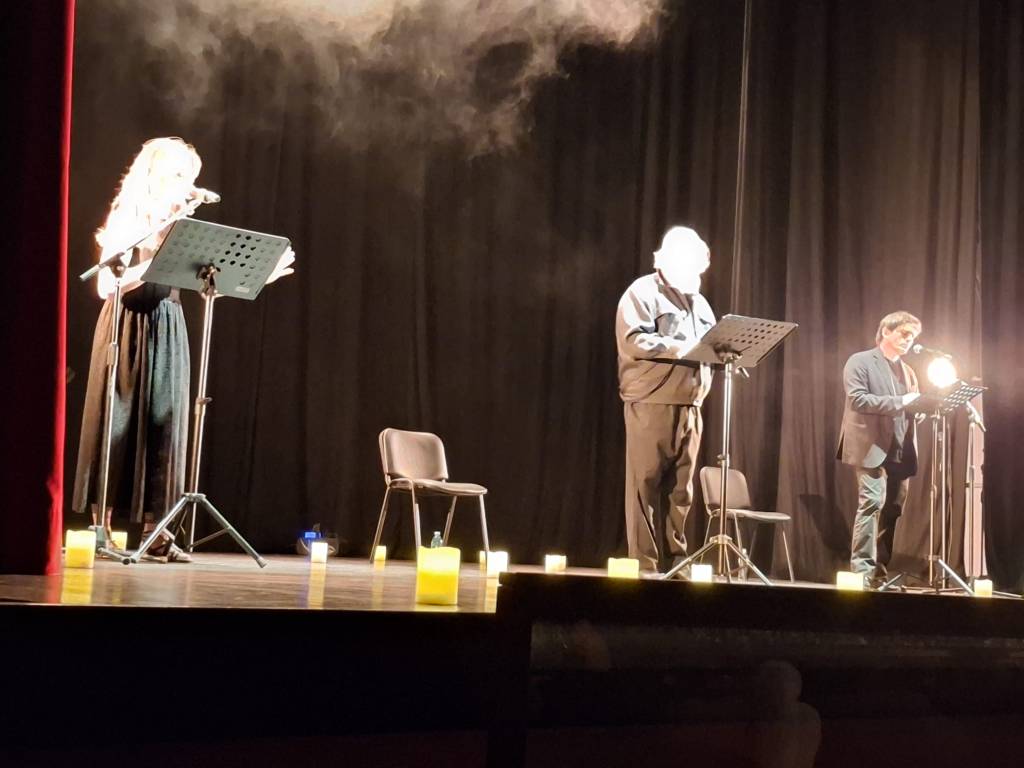 Sul palco tre attori che hanno dato voce ad alcuni personaggi delle Metamorfosi: Alcione, Ceice, Atteone che viene trasformato in cervo dalla dea Diana e infine la storia di Icaro e Dedalo (Icaro che per voler volare così in alto trovò la morte).