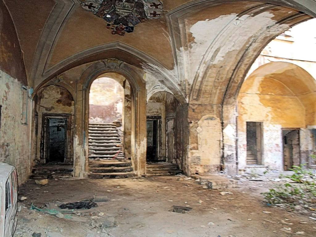 L’androne, ampio e solenne, conserva ancora stucchi decorativi che raccontano una cura estetica raffinata. Le superfici, pur segnate dal tempo, parlano di un’architettura pensata per rappresentare prestigio e potere.