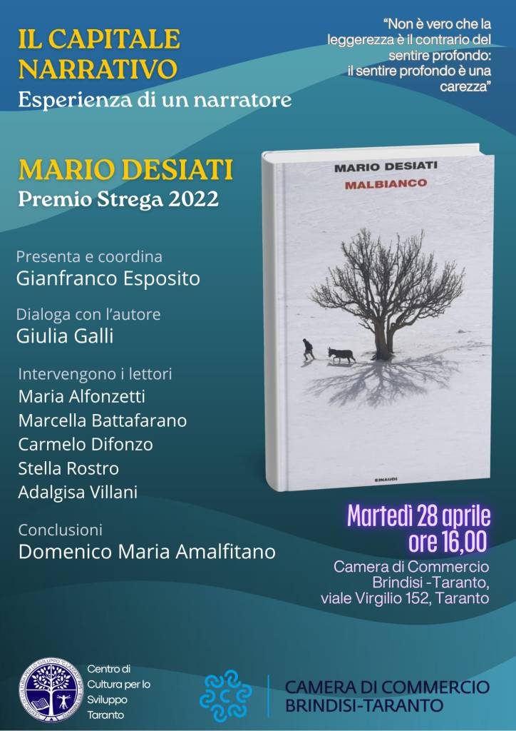 Il Centro di cultura per lo sviluppo G.LazzatiAps-ets Taranto e la Camera di commercio di Brindisi-Taranto incontrano il premio Strega 2022, il noto scrittore Mario Desiati, martedì 28 aprile 2026 alle ore 16:00. Desiati, che ha appena pubblicato il suo ultimo libro: Malbianco (Giulio Einaudi editore), parlerà di: “Il Capitale narrativo” esperienza di un narratore. Desiati – genus loci, narratore riconosciuto del nostro territorio, si sta dedicando alla ricerca con un gruppo di amici competenti e appassionati, che guideranno i presenti in un itinerario urgente e prezioso, apportando senso e memoria nell’incontrare il futuro.